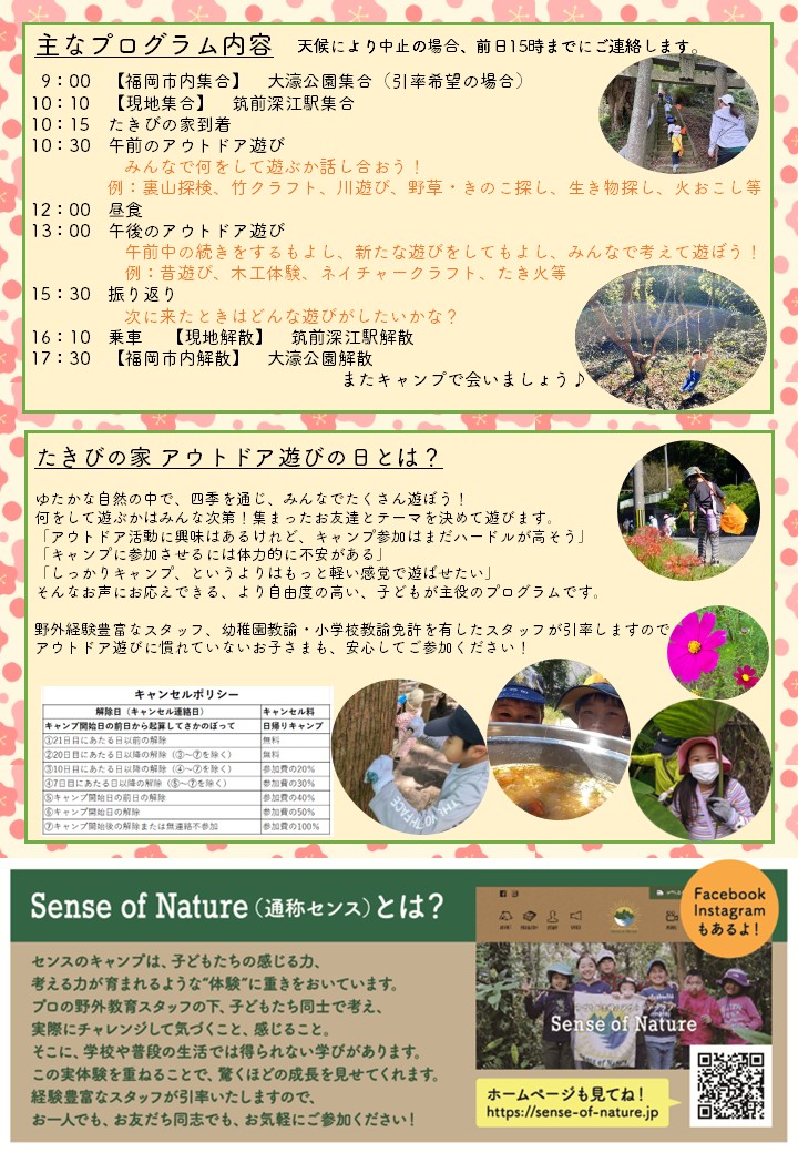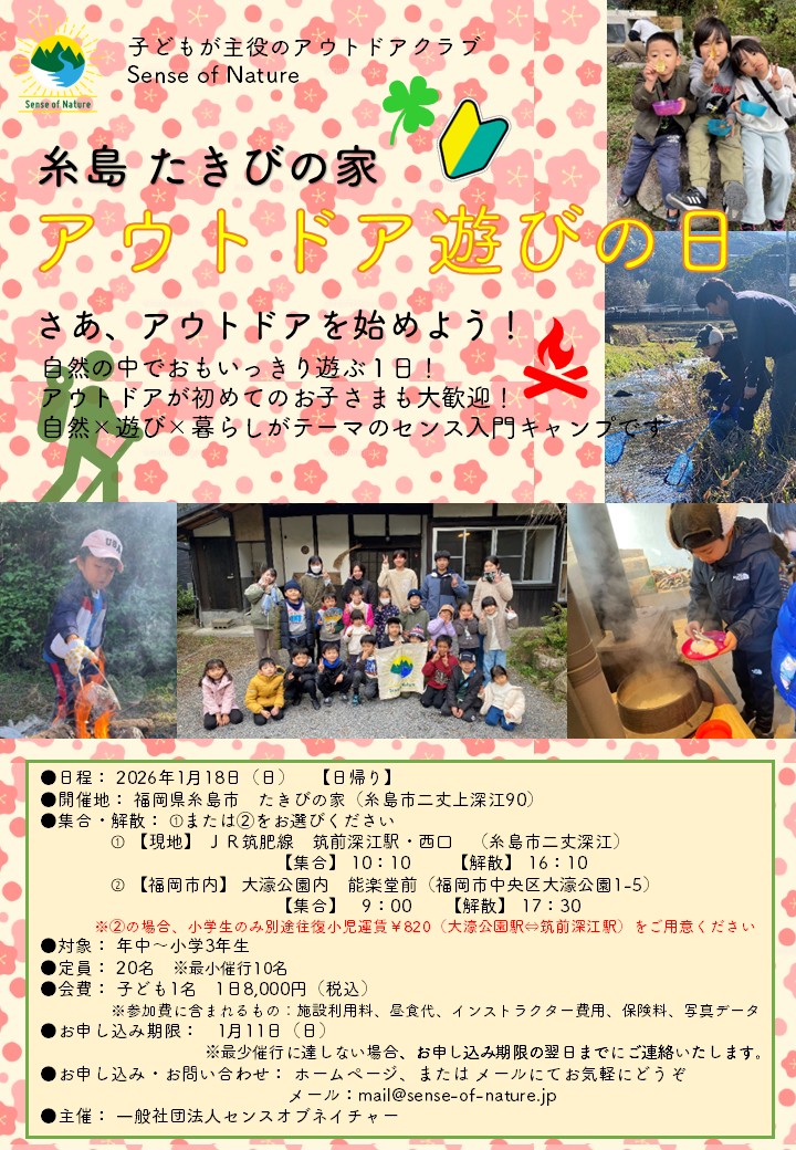 | 主催 | 一般社団法人センスオブネイチャー 〒819-1621 福岡県糸島市二丈上深江90 092-725-7229(平日10:00〜18:00) |