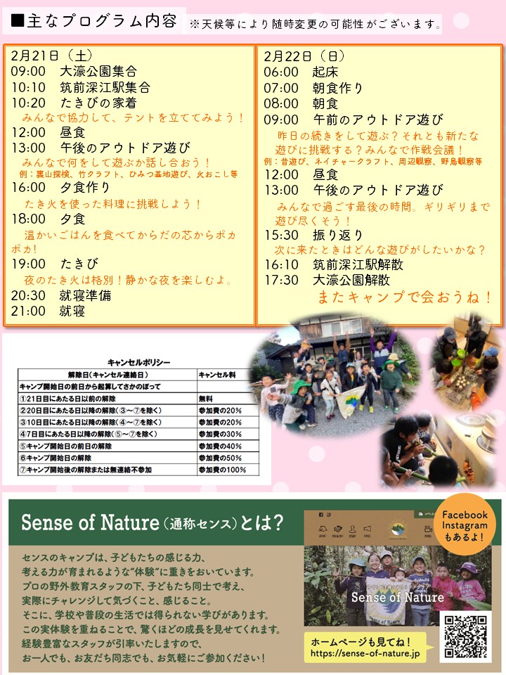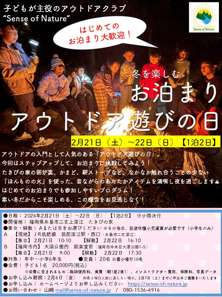 | 主催 | 一般社団法人センスオブネイチャー 〒819-1621 福岡県糸島市二丈上深江90 092-725-7229(平日10:00〜18:00) |