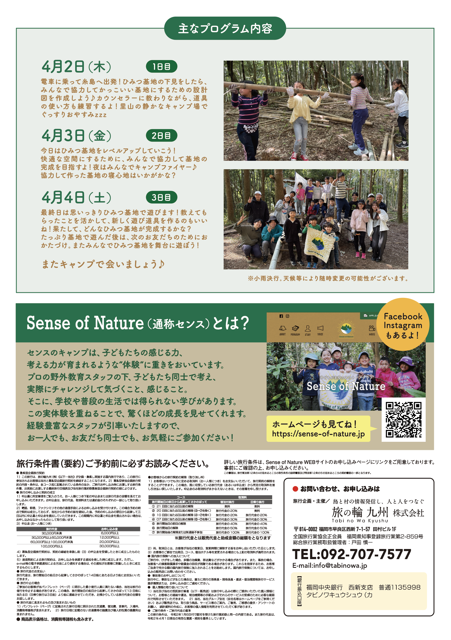 | 旅行代金 | 37,000円 (税込) ※旅行代金に含まれるもの:交通費、食事代(朝2回、昼3回、夕2回)、施設使用料、インストラクター費用、旅行保険代、写真データ、カウンセラーレポート |