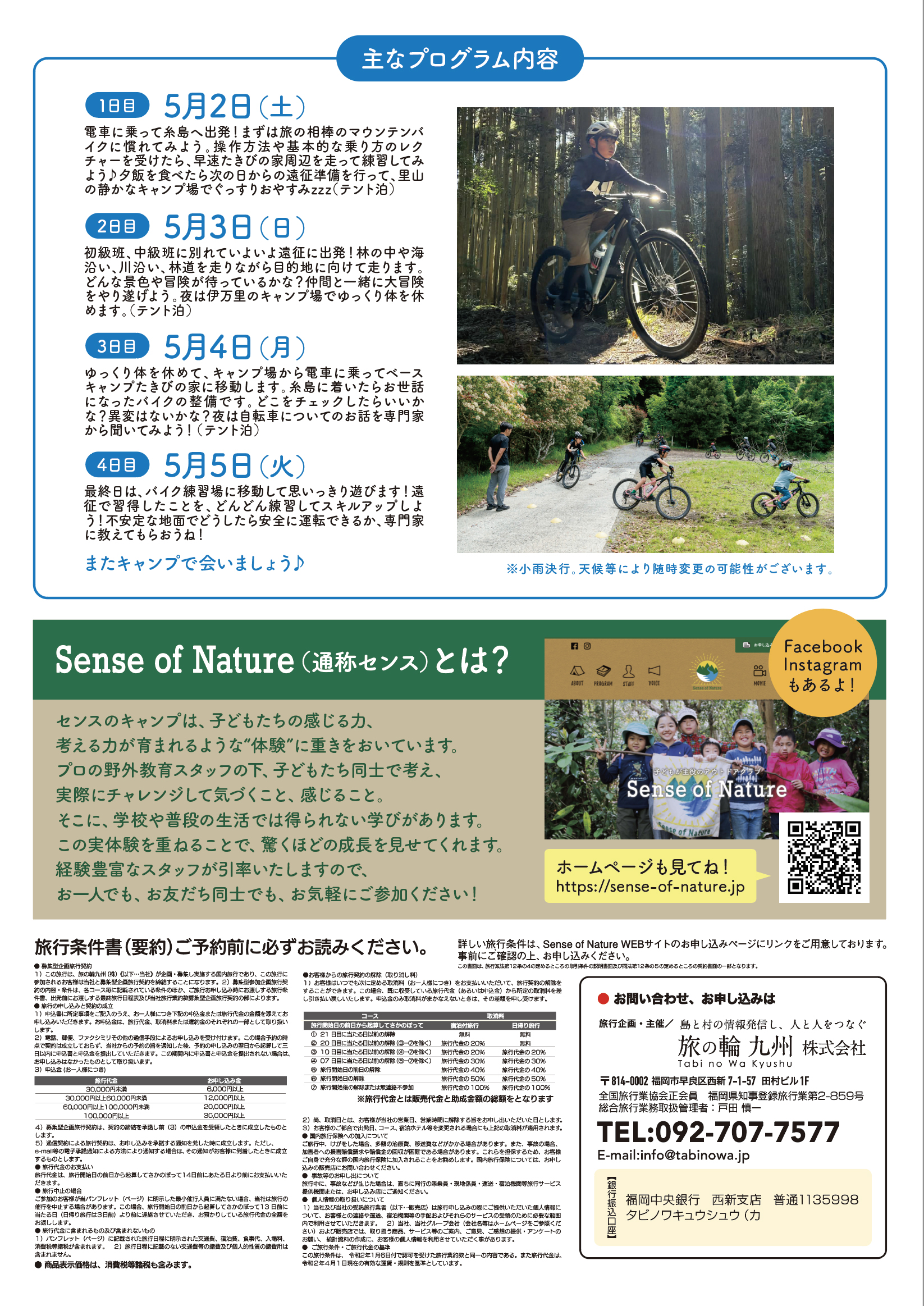 | 旅行代金 | 小学生 75,000円・中学生 78,000円(税込) ※旅行代金に含まれるもの:交通費、食事代(朝3回、昼4回、夕3回)、マウンテンバイク利用料、施設使用料、インストラクター費用、旅行保険代、写真データ、カウンセラーレポート |